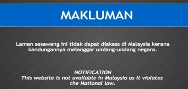 「This website is not available in Malaysia as it violates the National law.」(このウェブサイトはマレーシア国内法に違反するため、マレーシア国内からは利用できません。)というメッセージ