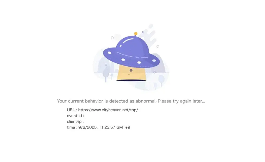 シティヘブンを海外から利用しようとすると、アクセスがブロックされてUFOのイラストが描かれたエラー画面が表示されてしまいます。
