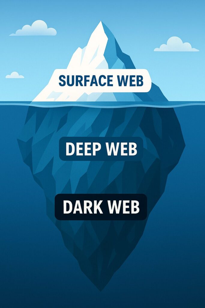 私たちが普段見ているのは海面に出ている氷山の一角(サーフェスウェブ)だけで、その下には広大な見えない領域(ディープウェブ)が広がっているのです。