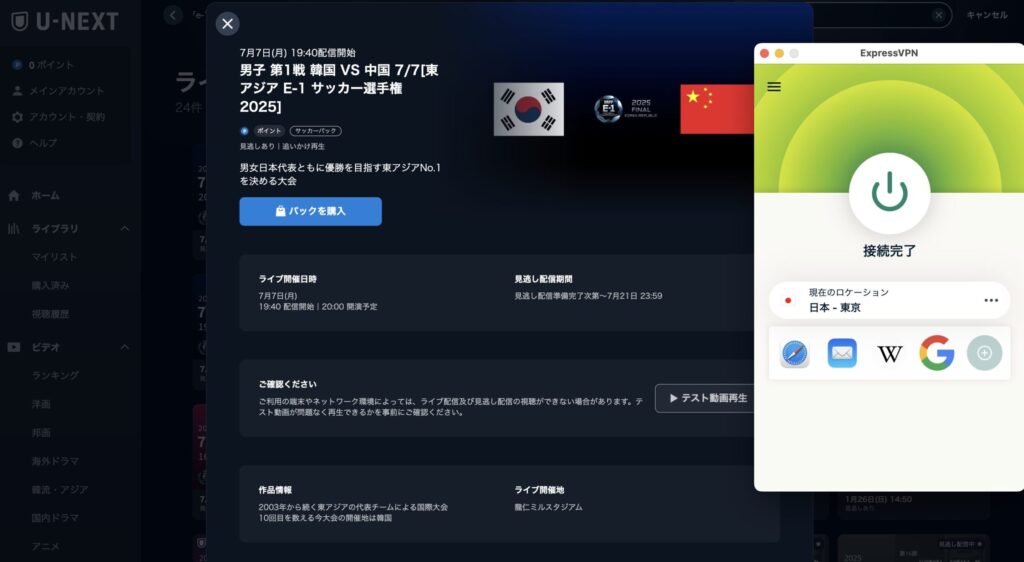 これで、海外にいながら「東アジアE-1サッカー選手権2025」を視聴できるようになります。