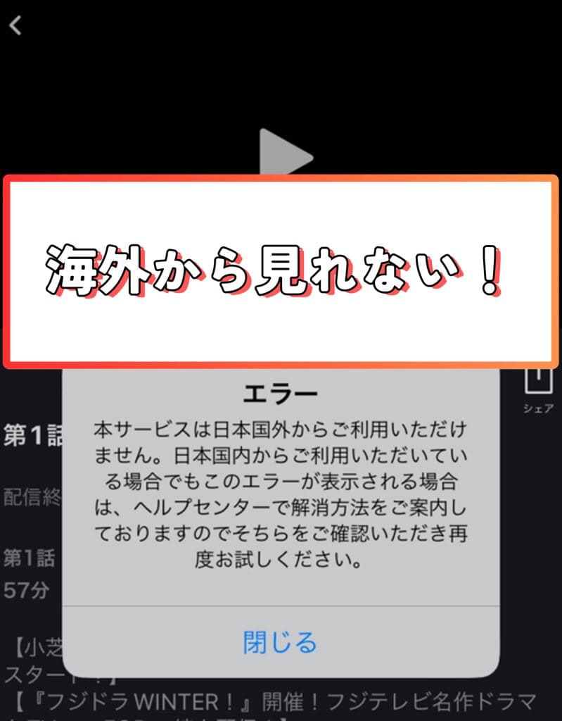 海外からFODプレミアムにアクセスするとエラー画面が表示され、動画を見ることはできません。