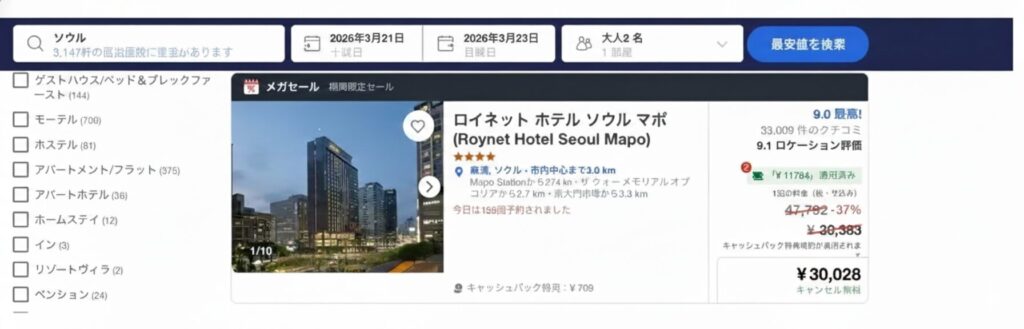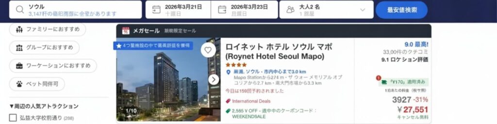実際の検証では、韓国のホテルで1泊あたり約2,500円の差額を確認できました。