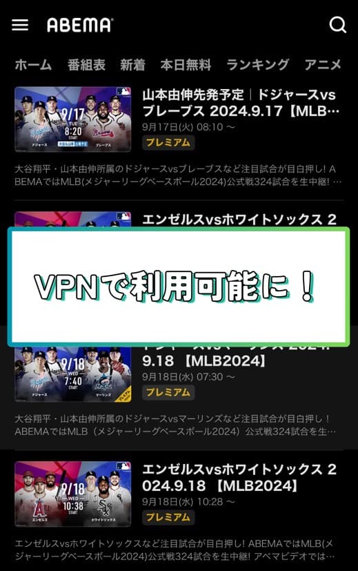 そのため、MLB(メジャーリーグ)が海外から視聴できません。