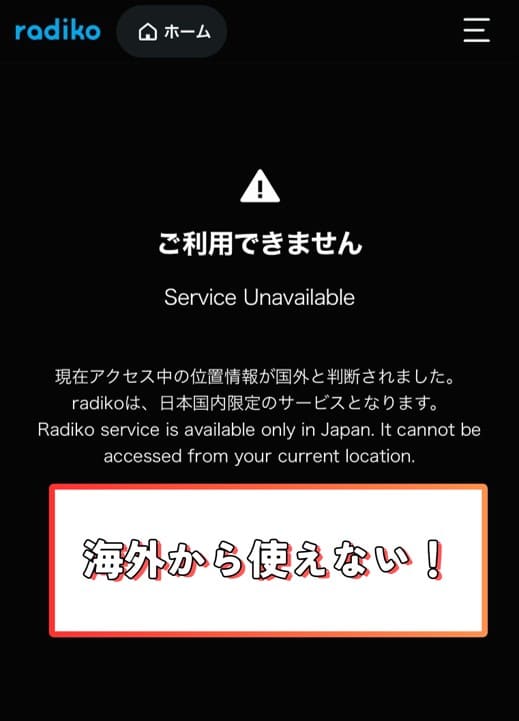 海外からradikoにアクセスするとエラー画面が表示され、サービスを使うことができません。