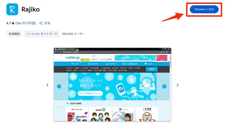 ウェブストアの検索ボックスに「rajiko」と入力すると、radikoの地域制限を解除できる拡張機能が表示されます。