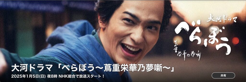 2025年のNHK大河ドラマは、横浜流星が主演の「べらぼう〜蔦重栄華乃夢噺〜」