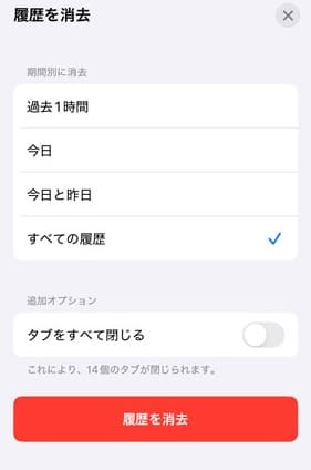 4. 確認画面で「すべての履歴」を選択後、「履歴を消去」ボタンをタップ