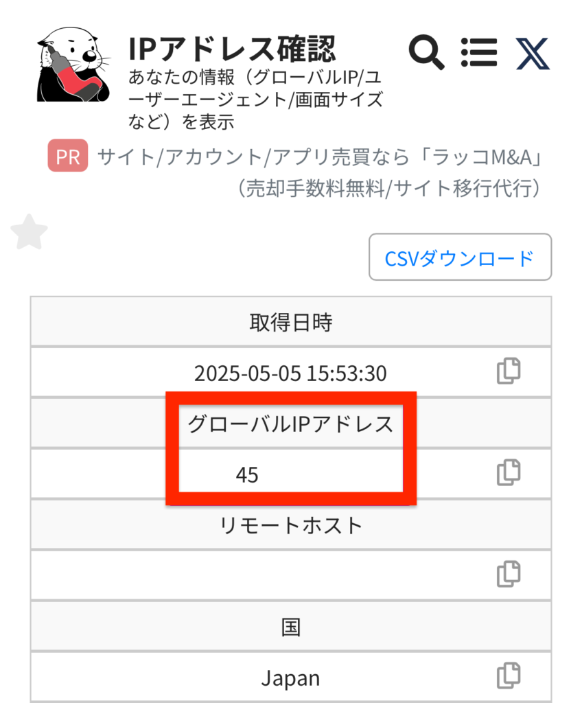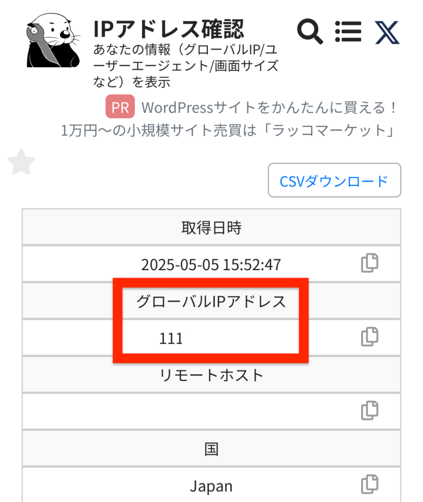 まず、ラッコツールズなどのIPアドレス確認サイトを利用して、現在のIPアドレスを確認します。ん